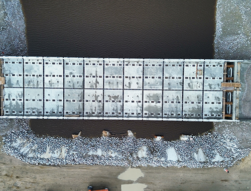 Deux portions du projet ont été réalisées en béton, soit les culées et le tablier préfabriqué. Les culées ont été construites selon une méthode conventionnelle en béton coulé en place.