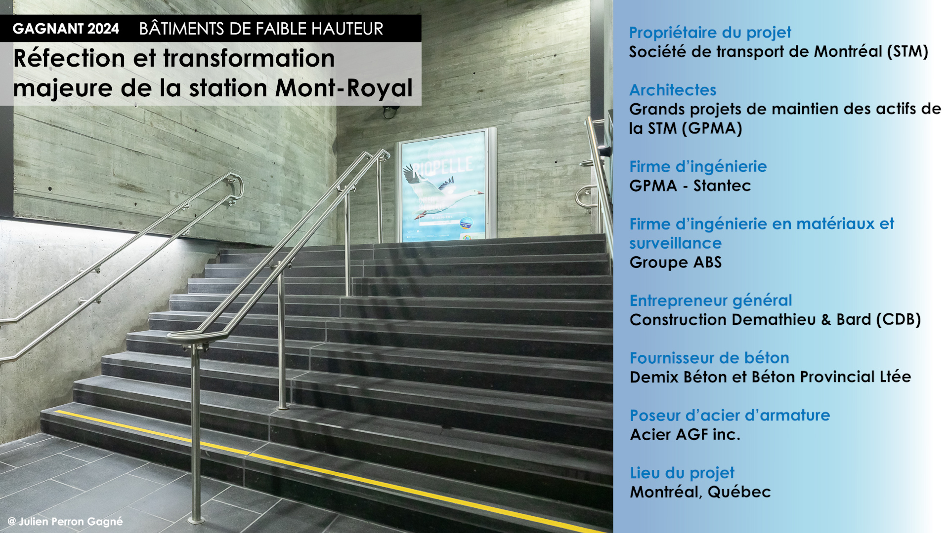 Le réseau du métro de Montréal illustre parfaitement le savoir-faire québécois en matière de construction de béton et de qualité architecturale. Le projet de transformation et de réfection de la station Mont-Royal tente sobrement d’honorer cette tradition architecturale unique du réseau de métro de Montréal. Les travaux, réalisés sur une période de quatre années et huit mois, ont permis de rendre la station de métro existante accessible universellement plus spacieuse et fonctionnelle. Le projet a également permis d’intégrer le concept architectural à la place sur laquelle il se trouve, par l’entremise d’une consultation publique élargie, faisant de ce projet un modèle de mobilité durable et d’inclusion sociale.