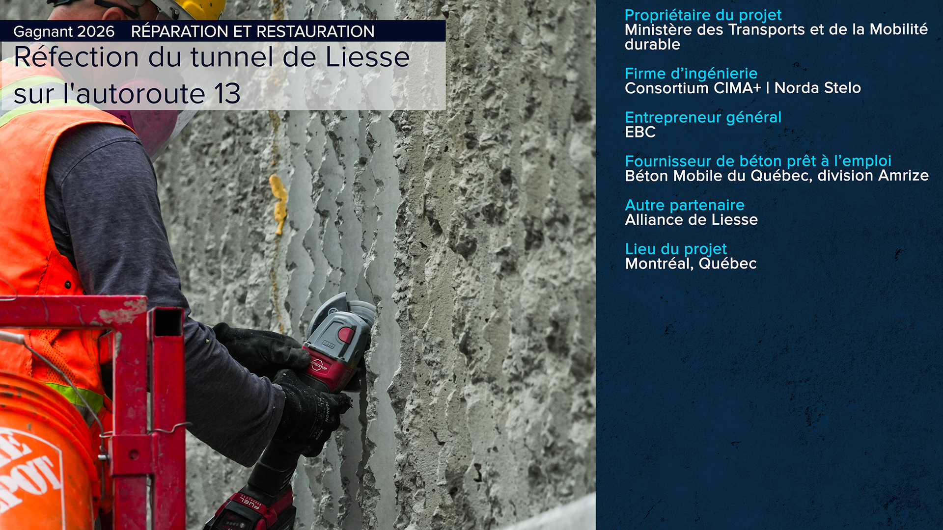 Dans le cadre de la réfection du tunnel de Liesse, le béton a joué un rôle central, démontrant sa polyvalence et ses performances techniques face aux exigences élevées de ce projet complexe. Treize formules de béton distinctes ont été soigneusement sélectionnées pour leurs propriétés spécifiques, en conformité avec la collection Normes – Ouvrages routiers du MTMD et le code CSA A23.1. Les travaux de bétonnage, totalisant environ 1400 mètres cubes de béton incluaient les travaux de réparations structurales, la reconstruction d’infrastructures routières et l’installation d’ouvrages électrotechniques.