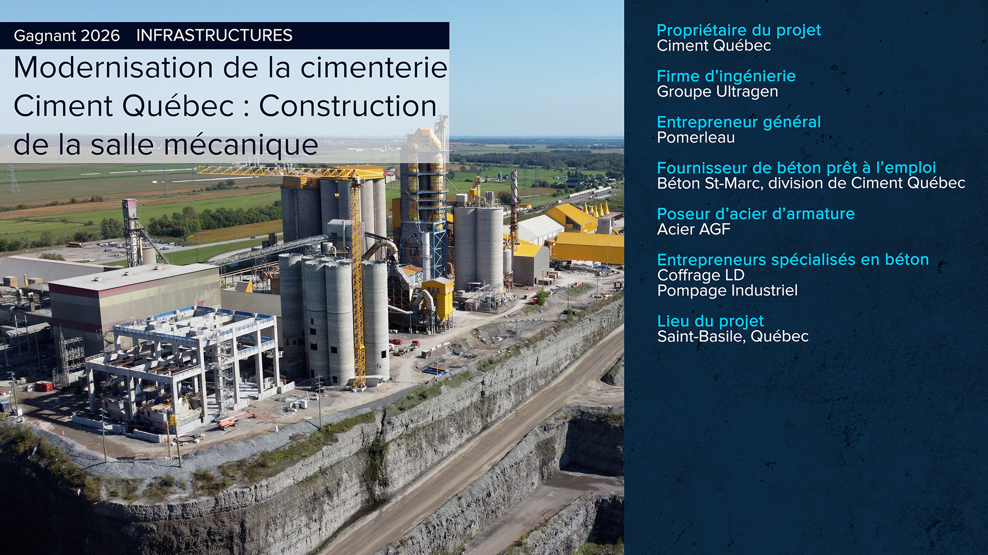 Dès les premières phases du projet, Ciment Québec inc., propriétaire de l’ouvrage, a clairement défini ses attentes quant à la performance du béton utilisé pour la construction des infrastructures. Le fournisseur, Béton St-Marc, devait livrer un béton à haute qualité esthétique et grande uniformité, tout en facilitant la mise en place au chantier. Ces exigences devaient s’inscrire dans un cadre d’exécution rigoureux, sans impact sur l’échéancier global, et intégrer un objectif central de réduction de l’empreinte carbone des matériaux.