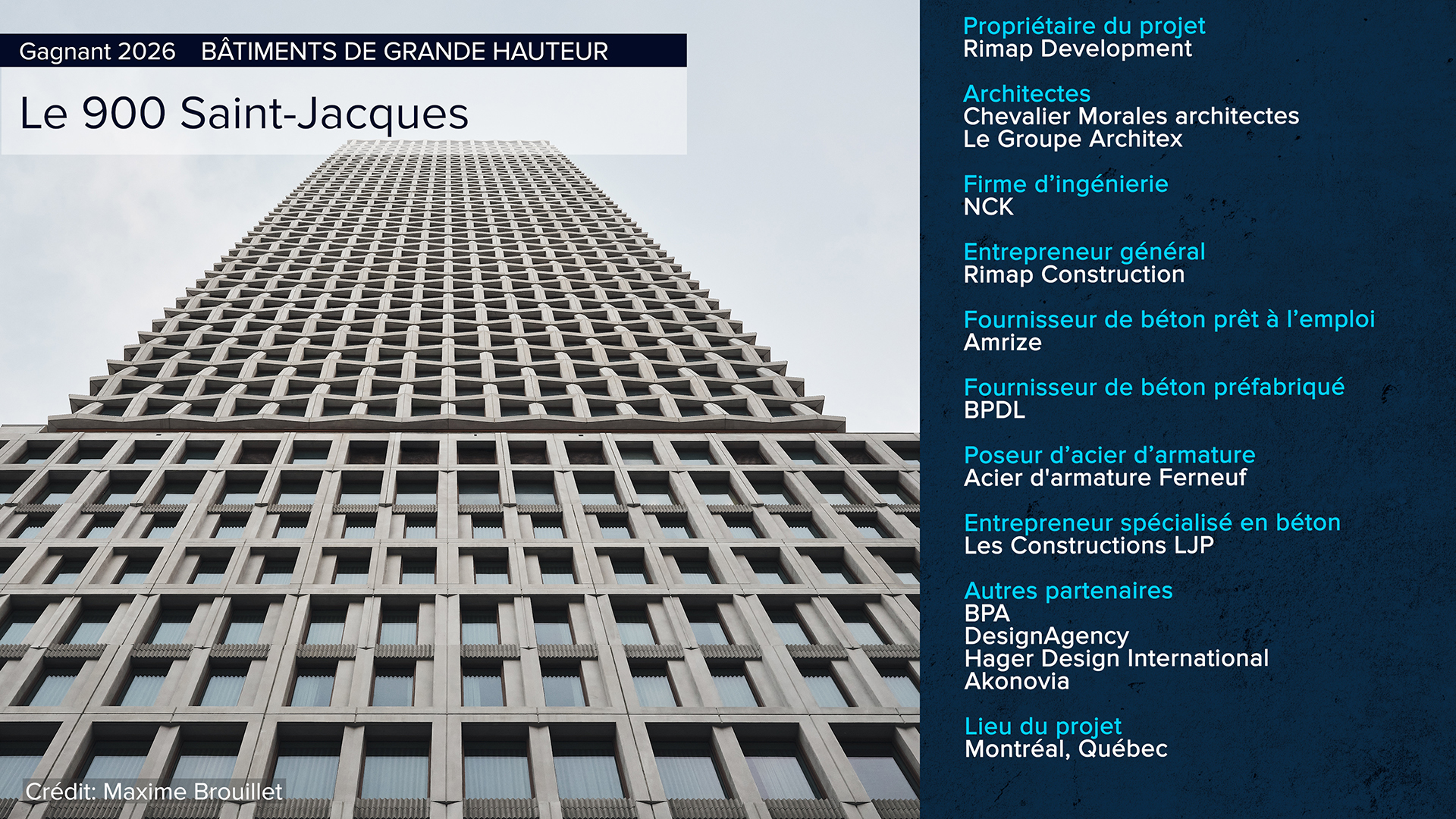 Récipiendaire d'un prix d'excellence aux Canadian Architect Awards 2025, le 900 Saint-Jacques est porteur d’une qualité architecturale dont l’exceptionnalité est saluée par le milieu et met au premier plan une utilisation du béton qui allie audace et expertise. Dans un contexte où les tours d’habitation sont majoritairement conçues en verre, le 900 Saint-Jacques affirme une présence contemporaine qui renoue avec la matérialité minérale typique de Montréal. Son enveloppe singulière en panneaux en béton préfabriqués aux lignes irrégulières génère un effet de tissage impressionnant.